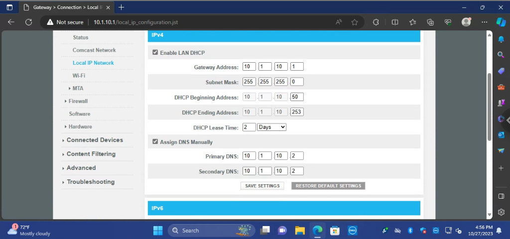 One Comcast CBR2-T Modem/router combo. Has a DHCP server configured to send out IP addresses Between 10.1.10.50-10.1.10.253 with an IP of 10.1.10.1, subnet 255.255.255.0, and DNS servers being 10.1.10.2. Has been reset multiple times and had content filtering and firewall settings turned off. (which is not needed but done so I don't get stupid answers from young blood on here)