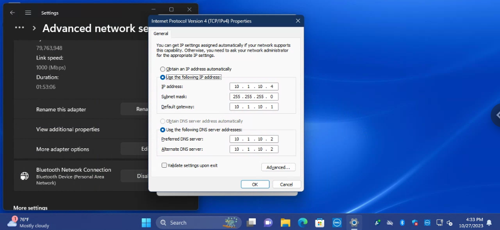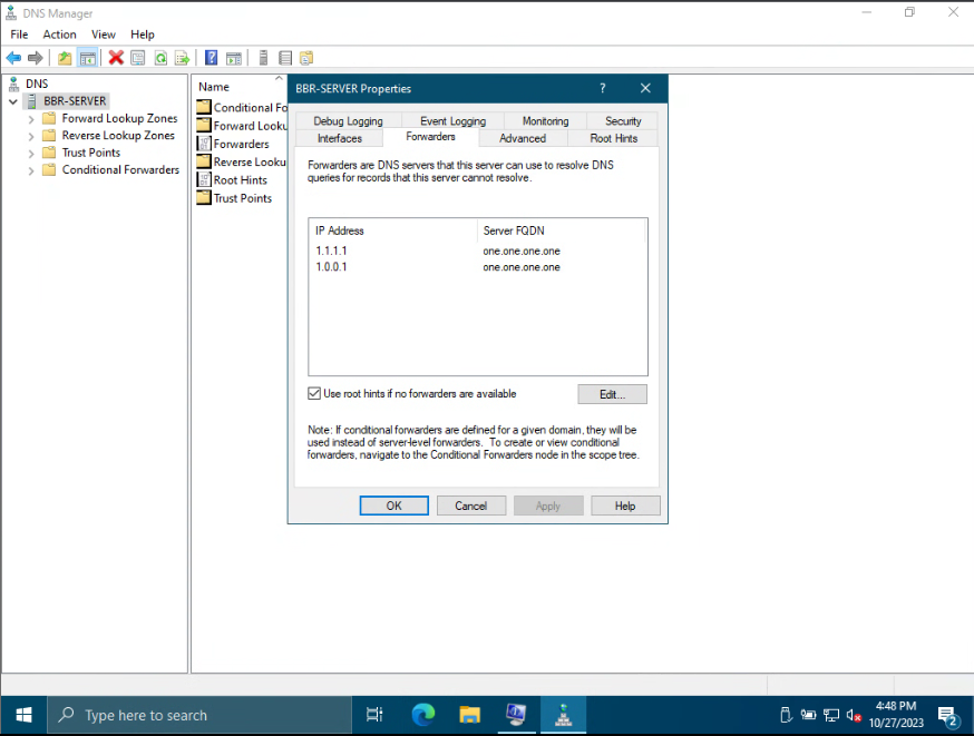 More Background: After I saw that message I went straight to the router thinking my DNS was assigned wrong through the DHCP server on the Comcast modem/router Combo but 10.1.10.2 is the IP address I assigned the server as well as the primary and secondary DNS I added to the DHCP server on the router right after I created the domain. Next, I started looking for issues other people had but everywhere online it was just the same stuff and answers. Double-check the DNS on your client which I did. I even just statically assigned an IP to the workstation and told it to use 10.1.10.2 as the DNS. Next, it says to Re-Register the DNS records on the Server. I deleted both forward lookup zones and then ran the command "ipconfig /registerdns" It just added them back. I then pinged my domain controller by name "bbr.internal" and got no response but I can ping the server "10.1.10.2" I then made sure the firewall allowed port 53 by running "test-netconnection 10.1.10.2 -port 53" after that I ran this command to see if the workstation could resolve the domain "Resolve-DNSName bbr.internal" and it failed. It's gotta be the DNS server records is what I'm thinking. I don't get it. I searched for how to fix srv records but it says they refresh so I forced them to refresh with no success. The server and workstations have been restarted many times during the troubleshooting and Windows Server has been reinstalled and re-setup with a DVD and Rufus flash drive to see if it was a corruption issue. The only thing inbetween them is the Comcast router which I removed all firewall and content filtering and reset to default during troubleshooting. I can ping each other's IP so I don't know how it would be an issue.