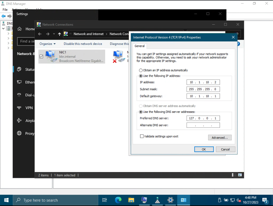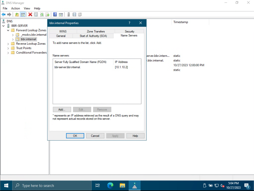 One PowerEdge T440 has an IP of 10.1.10.2 and a DNS address of its loopback IP. That is configured with a domain name of "bbr.internal" and Net bios name "bbr" Foward lookup zones have been remade with the command located at the beginning of this cry for help.