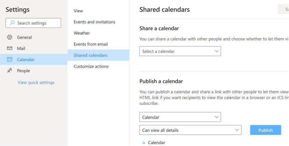 Next I tried following the directions from here on creating a calendar that's publicly available to everyone: https://www.bettercloud.com/monitor/the-academy/3-ways-to-share-your-outlook-calendar-with-others/ but didn't see any of these options.