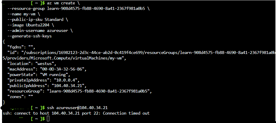Connect to the newly created VM using ssh (in cloud shell). We need to substitute the publicIpAddress noted above for <VM public ip address> in the command below: