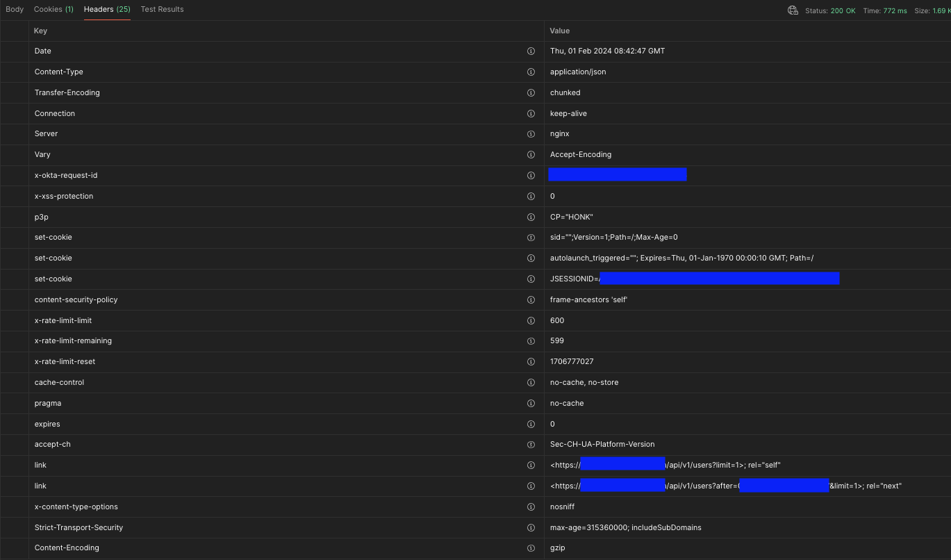 Could you please confirm if the same Okta API is working from Postman? If the same API is working outside of ADF, then there should not be an issue from ADF side. I did check ADF pagination, and it is working as expected with pagination. I will check back on this, please stay tuned! When tested the 2 Links in the Response Header...! I see that only one Link is read in the Response Header. It may be too soon for me to comment that ADF can read multiple links in Response, So let me check further on this.
