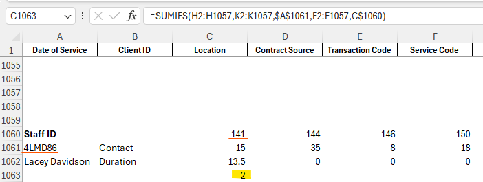 Please try the formula =SUMIFS(H2:H1057,K2:K1057,"4LMD86",F2:F1057,"141"). Or the formula based on your sample =SUMIFS(H2:H1057,K2:K1057,$A$1061,F2:F1057,C$1060).