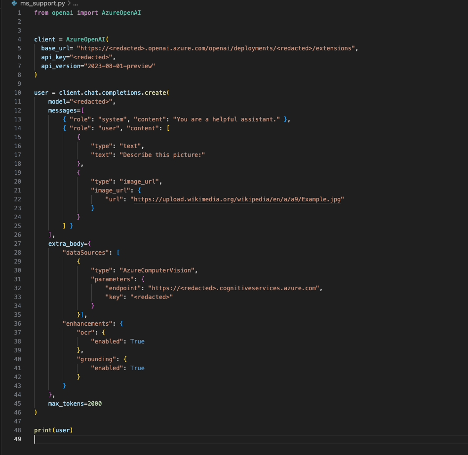 I'm receiving a persistent 500 Internal Server error while trying to run a simple gpt4-v example with the computer vision enhancements.
