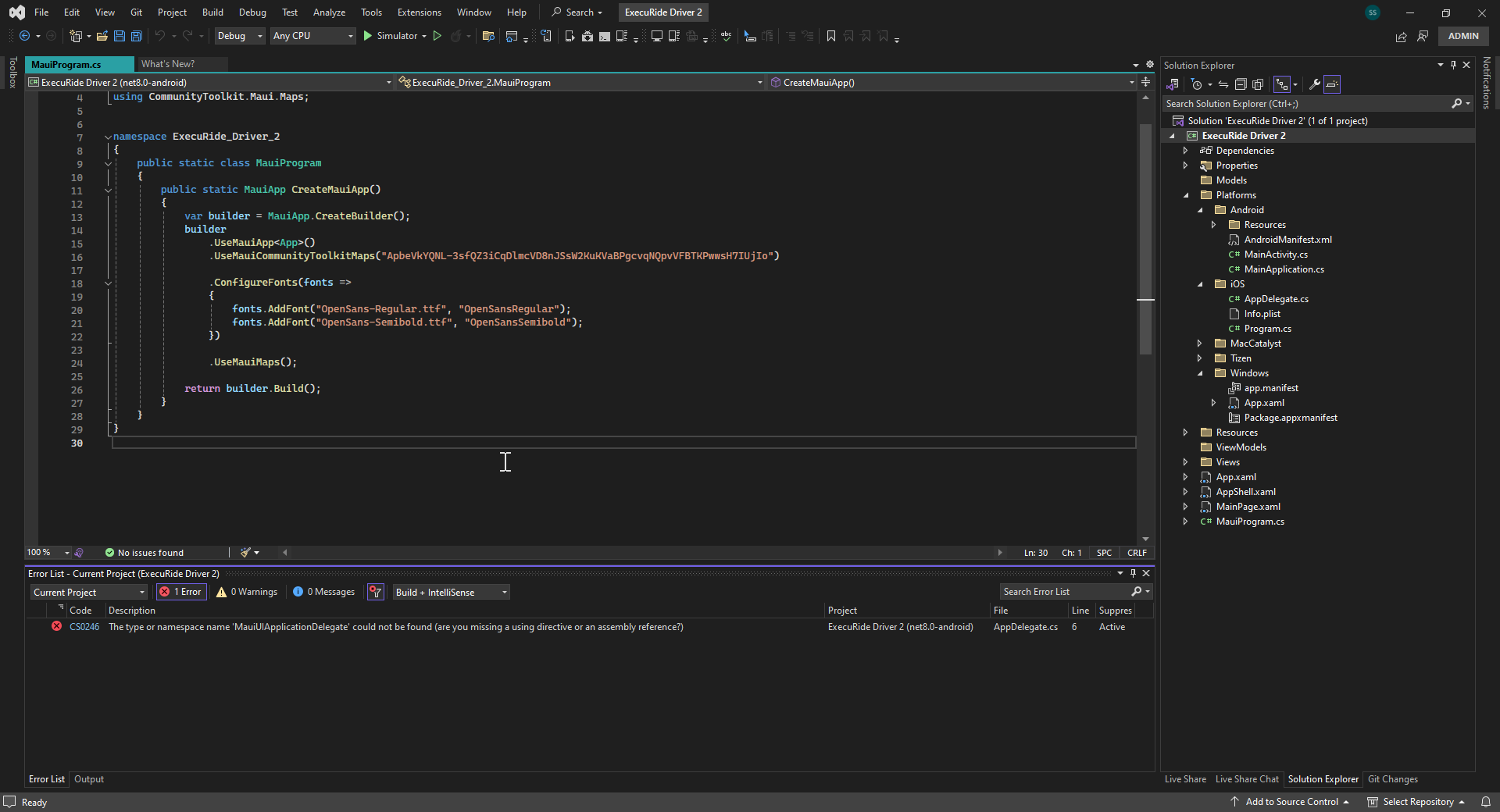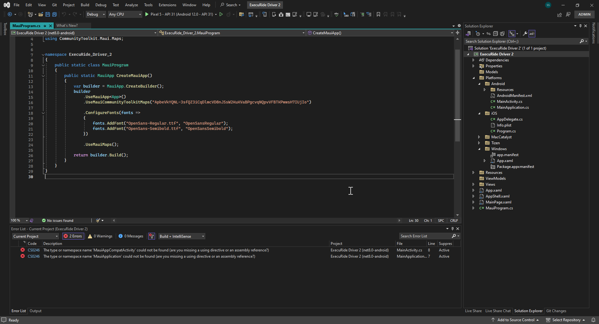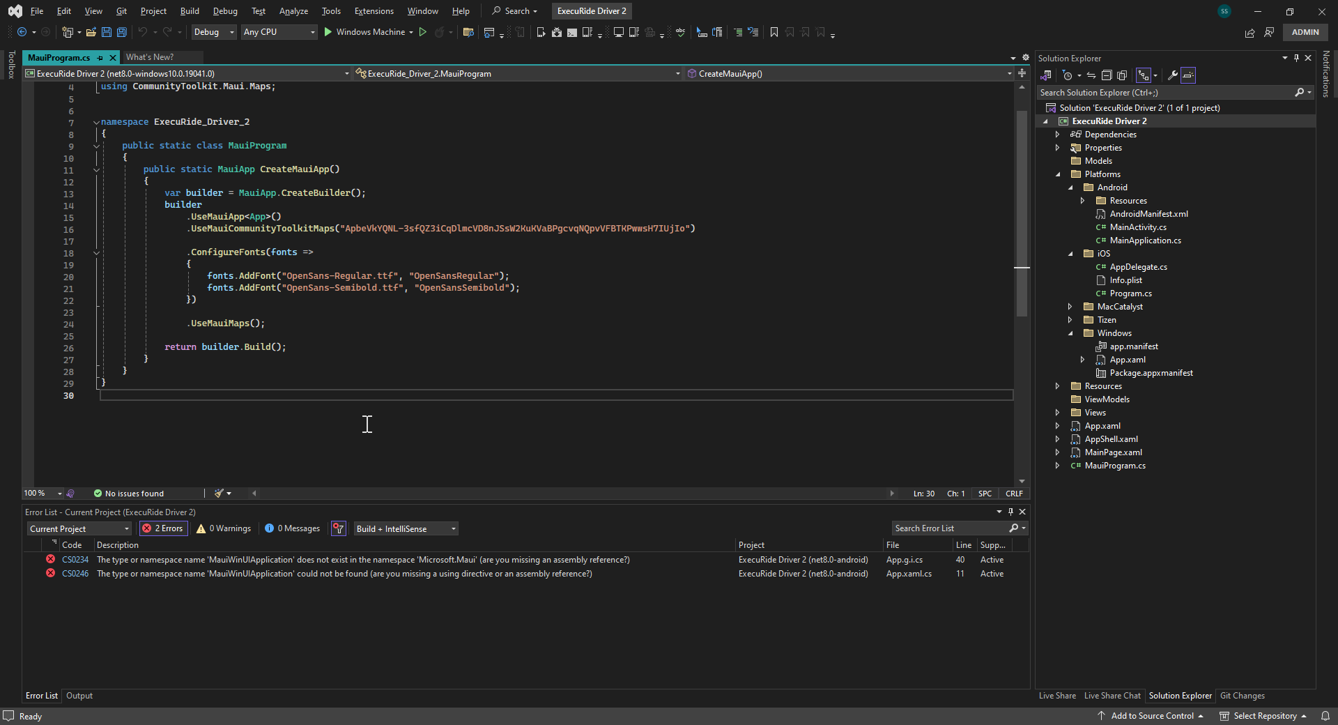 Severity Code Description Project File Line Suppression State Error CS0246 The type or namespace name 'MauiUIApplicationDelegate' could not be found (are you missing a using directive or an assembly reference?) ExecuRide Driver 2 (net8.0-android) C:\Users\squisw01\source\repos\squisw01\ExecuRide Driver 2\ExecuRide Driver 2\Platforms\iOS\AppDelegate.cs 6 Active Error CS0234 The type or namespace name 'MauiWinUIApplication' does not exist in the namespace 'Microsoft.Maui' (are you missing an assembly reference?) ExecuRide Driver 2 (net8.0-windows10.0.19041.0) C:\Users\squisw01\source\repos\squisw01\ExecuRide Driver 2\ExecuRide Driver 2\obj\Debug\net8.0-windows10.0.19041.0\win10-x64\Platforms\Windows\App.g.i.cs 40 Active Error CS0234 The type or namespace name 'MauiWinUIApplication' does not exist in the namespace 'Microsoft.Maui' (are you missing an assembly reference?) ExecuRide Driver 2 (net8.0-android) C:\Users\squisw01\source\repos\squisw01\ExecuRide Driver 2\ExecuRide Driver 2\obj\Debug\net8.0-windows10.0.19041.0\win10-x64\Platforms\Windows\App.g.i.cs 40 Active Error CS0246 The type or namespace name 'MauiAppCompatActivity' could not be found (are you missing a using directive or an assembly reference?) ExecuRide Driver 2 (net8.0-android) C:\Users\squisw01\source\repos\squisw01\ExecuRide Driver 2\ExecuRide Driver 2\Platforms\Android\MainActivity.cs 8 Active Error CS0246 The type or namespace name 'MauiApplication' could not be found (are you missing a using directive or an assembly reference?) ExecuRide Driver 2 (net8.0-android) C:\Users\squisw01\source\repos\squisw01\ExecuRide Driver 2\ExecuRide Driver 2\Platforms\Android\MainApplication.cs 7 Active Error CS0246 The type or namespace name 'MauiUIApplicationDelegate' could not be found (are you missing a using directive or an assembly reference?) ExecuRide Driver 2 (net8.0-android) C:\Users\squisw01\source\repos\squisw01\ExecuRide Driver 2\ExecuRide Driver 2\Platforms\MacCatalyst\AppDelegate.cs 6 Active Error CS0246 The type or namespace name 'MauiWinUIApplication' could not be found (are you missing a using directive or an assembly reference?) ExecuRide Driver 2 (net8.0-android) C:\Users\squisw01\source\repos\squisw01\ExecuRide Driver 2\ExecuRide Driver 2\Platforms\Windows\App.xaml.cs 11 Active Error CS0103 The name 'DebugSettings' does not exist in the current context ExecuRide Driver 2 (net8.0-windows10.0.19041.0) C:\Users\squisw01\source\repos\squisw01\ExecuRide Driver 2\ExecuRide Driver 2\obj\Debug\net8.0-windows10.0.19041.0\win10-x64\Platforms\Windows\App.g.i.cs 60 Active Error CS0103 The name 'UnhandledException' does not exist in the current context ExecuRide Driver 2 (net8.0-windows10.0.19041.0) C:\Users\squisw01\source\repos\squisw01\ExecuRide Driver 2\ExecuRide Driver 2\obj\Debug\net8.0-windows10.0.19041.0\win10-x64\Platforms\Windows\App.g.i.cs 66 Active