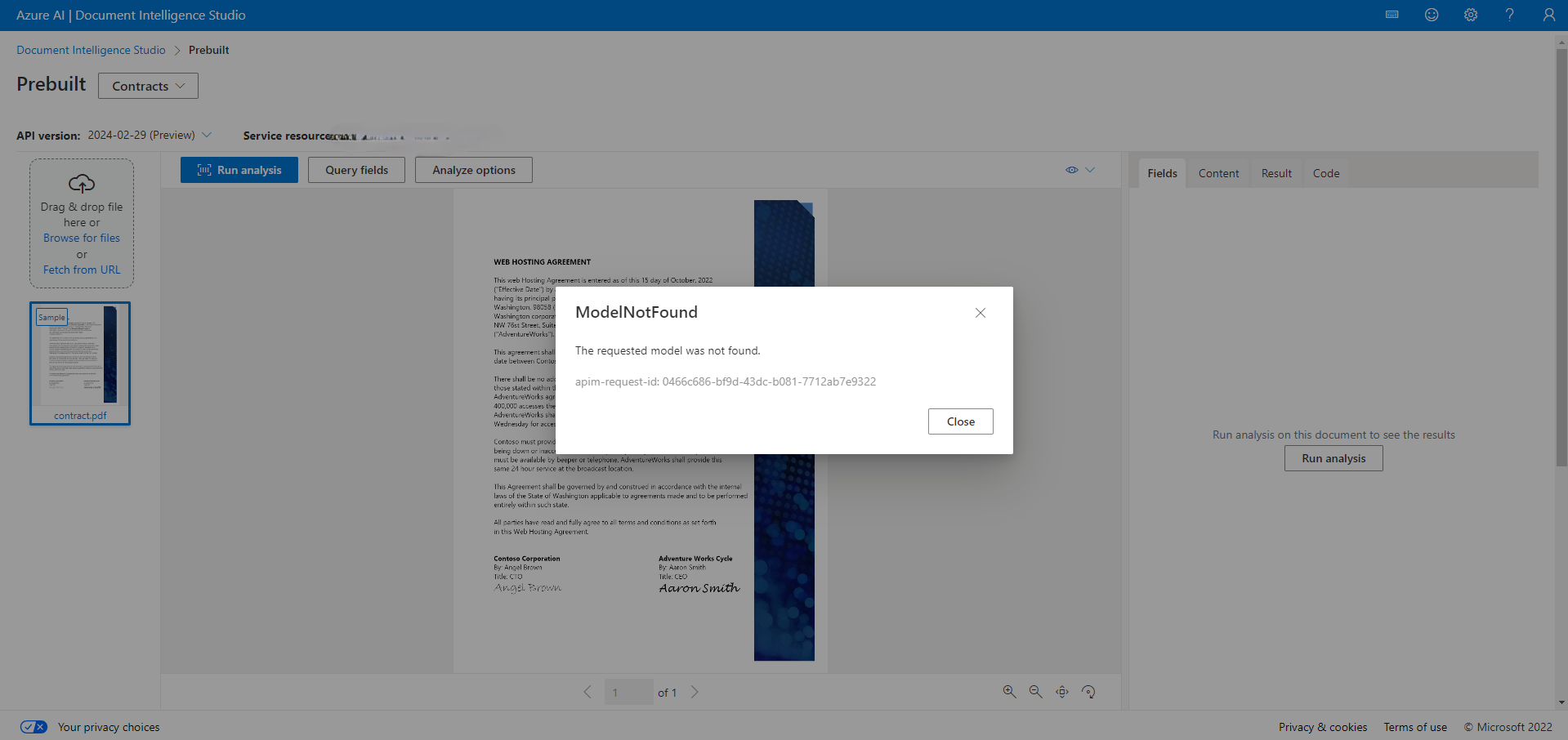 The temporary workaround is to work with the West Europe region as this error occurs with the East US and West US 2 resource regions. (version: 2024-02-29-preview)