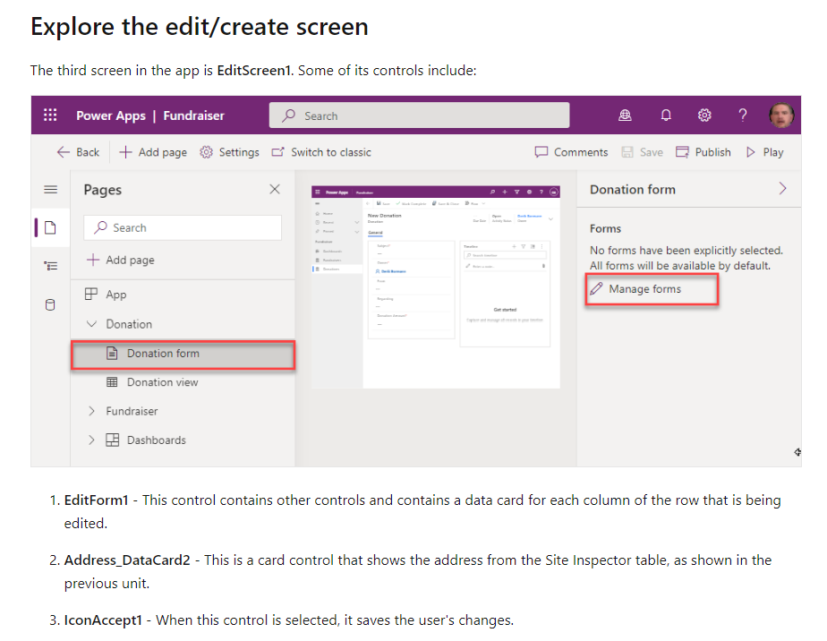 The screenshots provided there are not matching to the content as the images are of a fundraiser model driven app