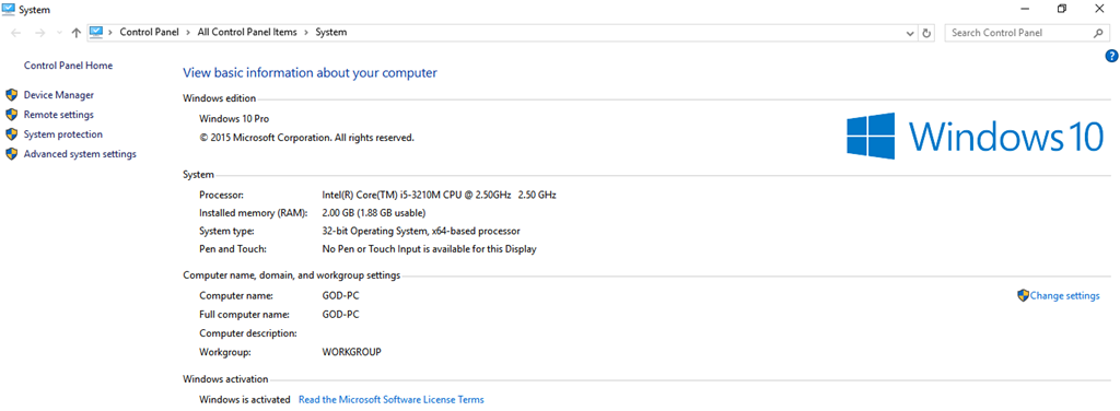 Running Windows 10 Pro on a 32 bit Operating System (specs shown below)