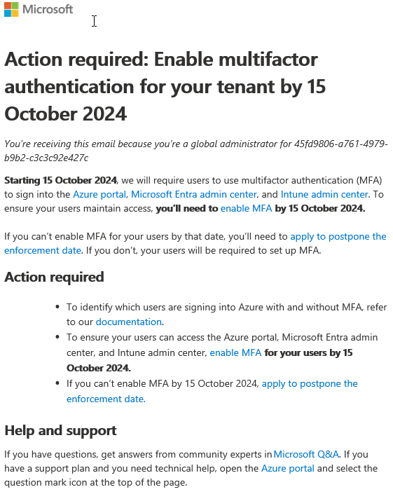 I received this email (screenshot) saying that I must enable MFA by October 15. I get the impression that if I don't enable MFA, I will lose access to my Azure portal and resources. But I read the documentation links in the email and it is still very unclear to me what I need to do. I also browsed my Azure portal and I still can't figure it out.