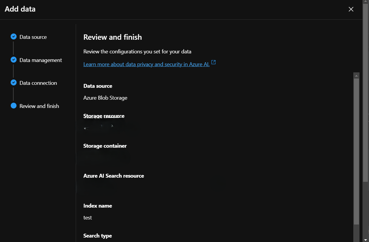 All services are connected via private endpoints. When I test the setup in Azure OpenAI Studio by navigating to Chat → Add your data → Add a data source, I select my Storage Account, choose the container, then select the AI Search service, provide an index name, and choose the Azure OpenAI embedding model with API-Key authentication. However, when I click Next, I receive the following errors: