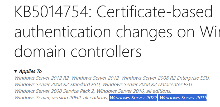 "We have a Domain Controller (DC) running on Server 2022, and a PKI server running on Server 2019. Will this configuration have any impact on our environment? If so, what are the KB articles that address this issue for Server 2022 and Server 2019? as we see that KB5014754 is application to server 2012 and 2016 only.