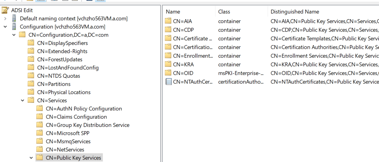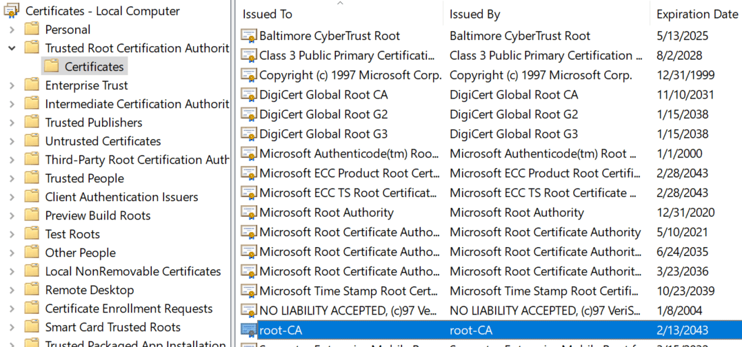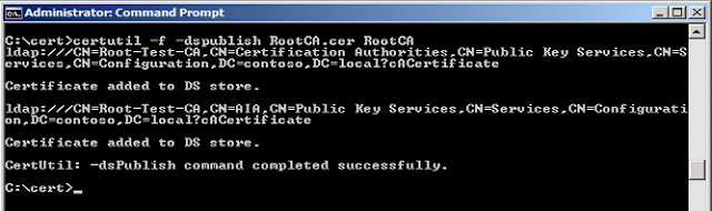Active Directory Certificate Services added the root certificate of certificate chain 0 to the downloaded Trusted Root Certification Authorities Enterprise store on the CA computer. This store will be updated from the Certification Authorities container in Active Directory the next time Group Policy is applied. To verify that the CA certificate is published correctly in Active Directory, run the following command: certutil -viewstore "ldap:///CN=My-Enterprise-CA,CN=Certification Authorities,CN=Public Key Services,CN=Services,CN=Configuration,DC=corp,DC=mydomain,DC=com?cACertificate?base?objectClass=certification Authority" (you must include the quotation marks when you run this command). If the root CA certificate is not present, use the Certificates console on the root CA computer to export the certificate to a file, and then run the following command to publish it to Active Directory: Certutil -dspublish %certificatefilename% Root.