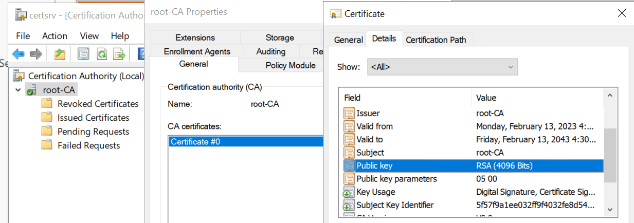 - Setup a non-domain joined, offline Windows 2019 Server as the Root-CA, hardened to prevent access from non-administrative types. This machine issues the Root-CA and the Subordinate Enterprise-CA hosted on another domain joined server.