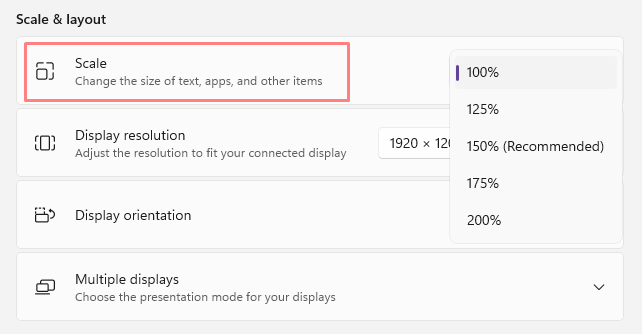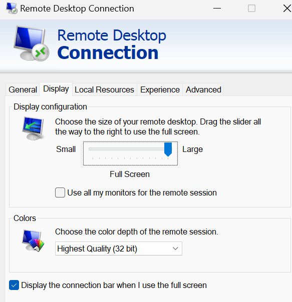 On "Display configuation" settings, you can change the "Remote Desktop Connection” display by moving the slider from "Small to Large".
