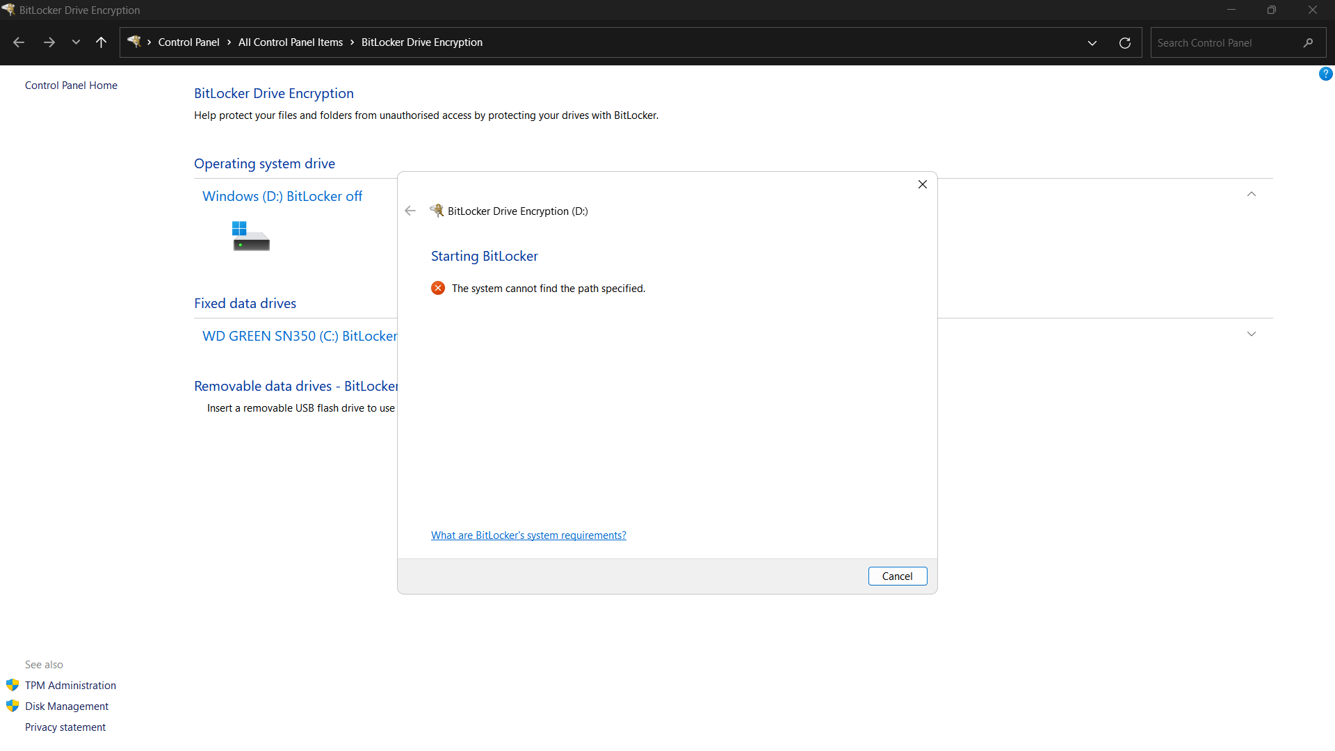 o, I installed a new SSD on my laptop and cloned using Acronis True Image Western Digital Edition & before that I turned off the bitlocker. Now after it got cloned, I encrypted the previous SSD but when I am trying for the new SSD it shows this error.