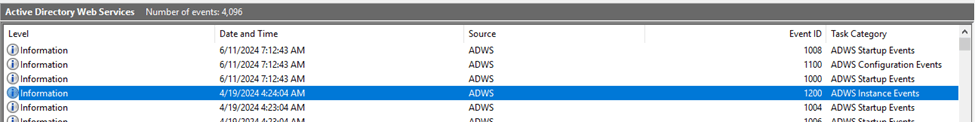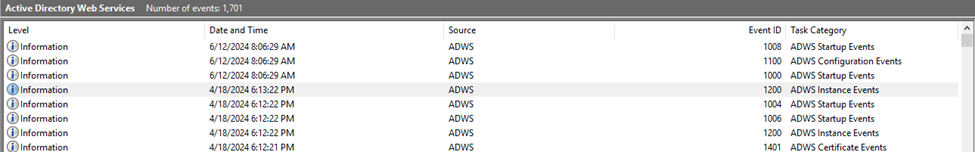 Event ID 1100 -The values specified in the <appsettings> section of the configuration file for Active Directory Web Services have been loaded without errors.