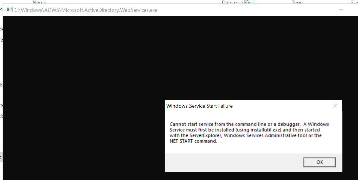 No. I am hoping it does not come to that. What is missing on both controllers is the ADWS service itself. In the directory above, "Microsoft.ActiveDirectory.WebServices.exe" is found. This would be the executable called upon as ADWS when installed as a service correct? If double clicked, you get this: