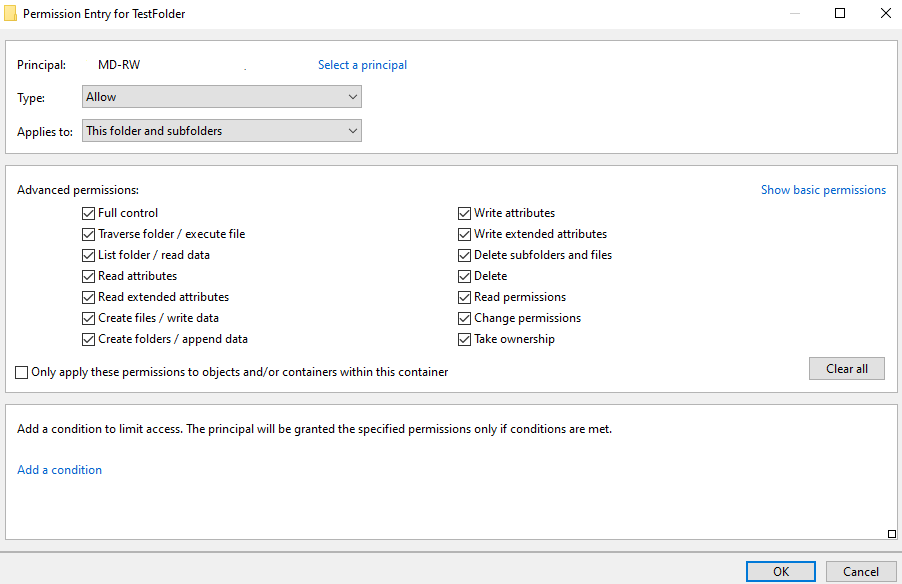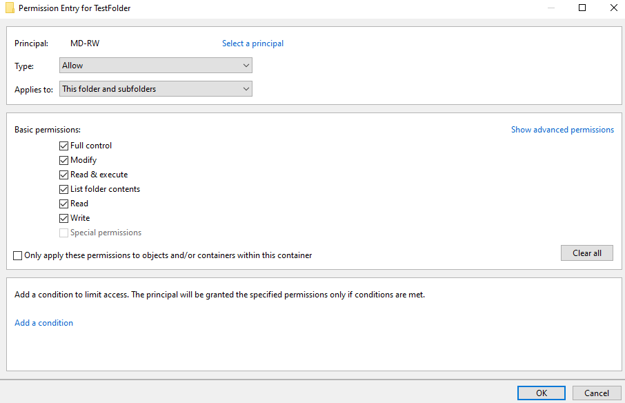- Choose the type of permission you want to assign (e.g., Full Control, Modify, Read & Execute, List Folder Contents, Read, Write).