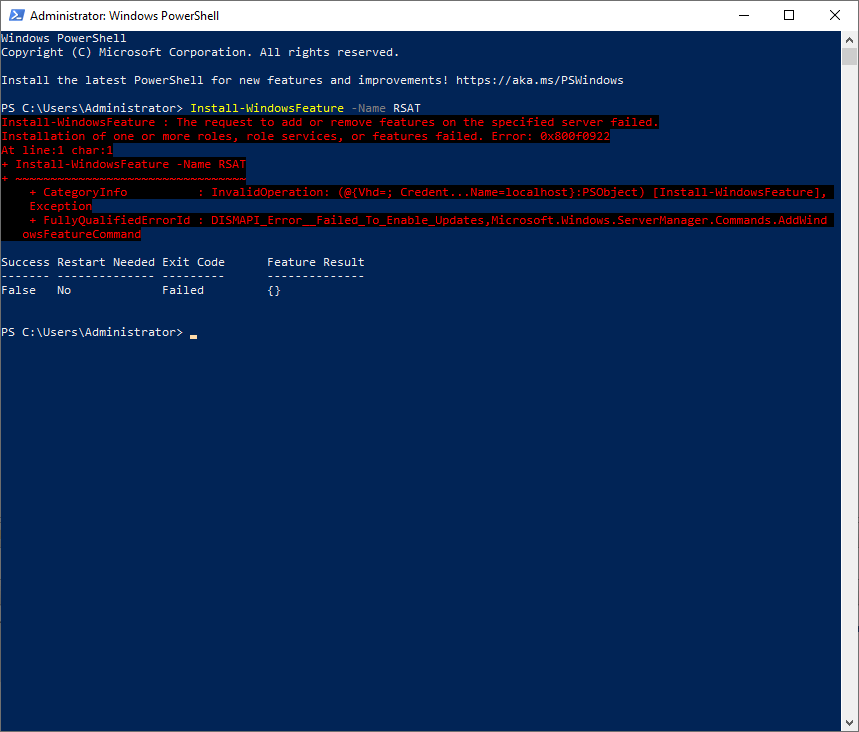I have an issue with installing any RSAT packages onto a system using power shell. Following several sites regarding how to do this (including microsoft learn), all I get is the below screen. It does show a green screen showing its installing, however RSAT DNS still does not appear in server manager. Please help.