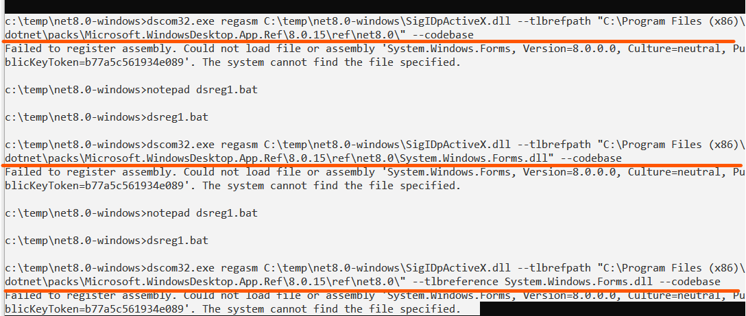 is test.exe a 64 bit application (if so, why in x86 folder)? also as .net 8 can only build 64 bit active/x dlls, it should probably should be in the "program files\aa" folder.
