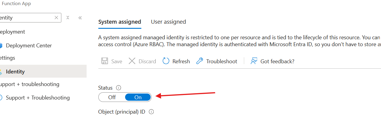 I have an Azure Function which we enabled its managed Identity, as follow:-
