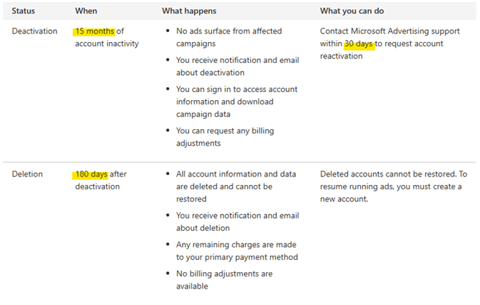 Here is what happens when an account is subject to the Microsoft Advertising deletion policy due to inactivity.