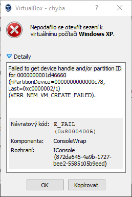VirtualBox - Failed to get device handle and/or partition ID