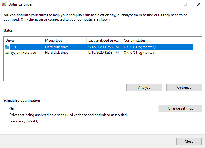 There is an issue regarding Disk Optimization not running properly in VMware. The Host is on SSD, the Guest is on HDD. Had to resort to a snapshot over month old, thus the 09/16 start date which was run manually.