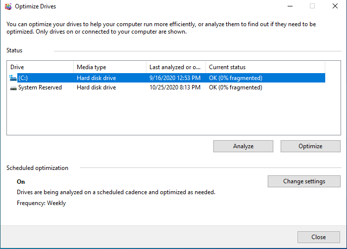According to Task Scheduler, the Scheduled Defrag did run 10/25. Optimize Drives does reflect this on the System Reserved partition but not the C:Drive itself.