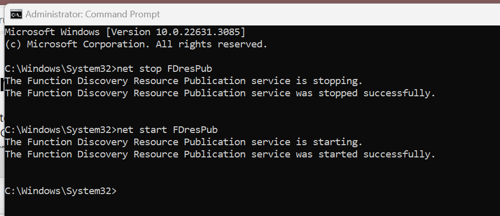 I issue the commands below to stop and then start the service, after that my PC shows up on the network correctly.