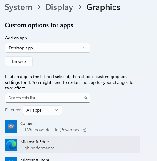 Double-click Nvidia Control Panel in the taskbar - Manage 3D Settings - Select by Program - Edge - High Performance