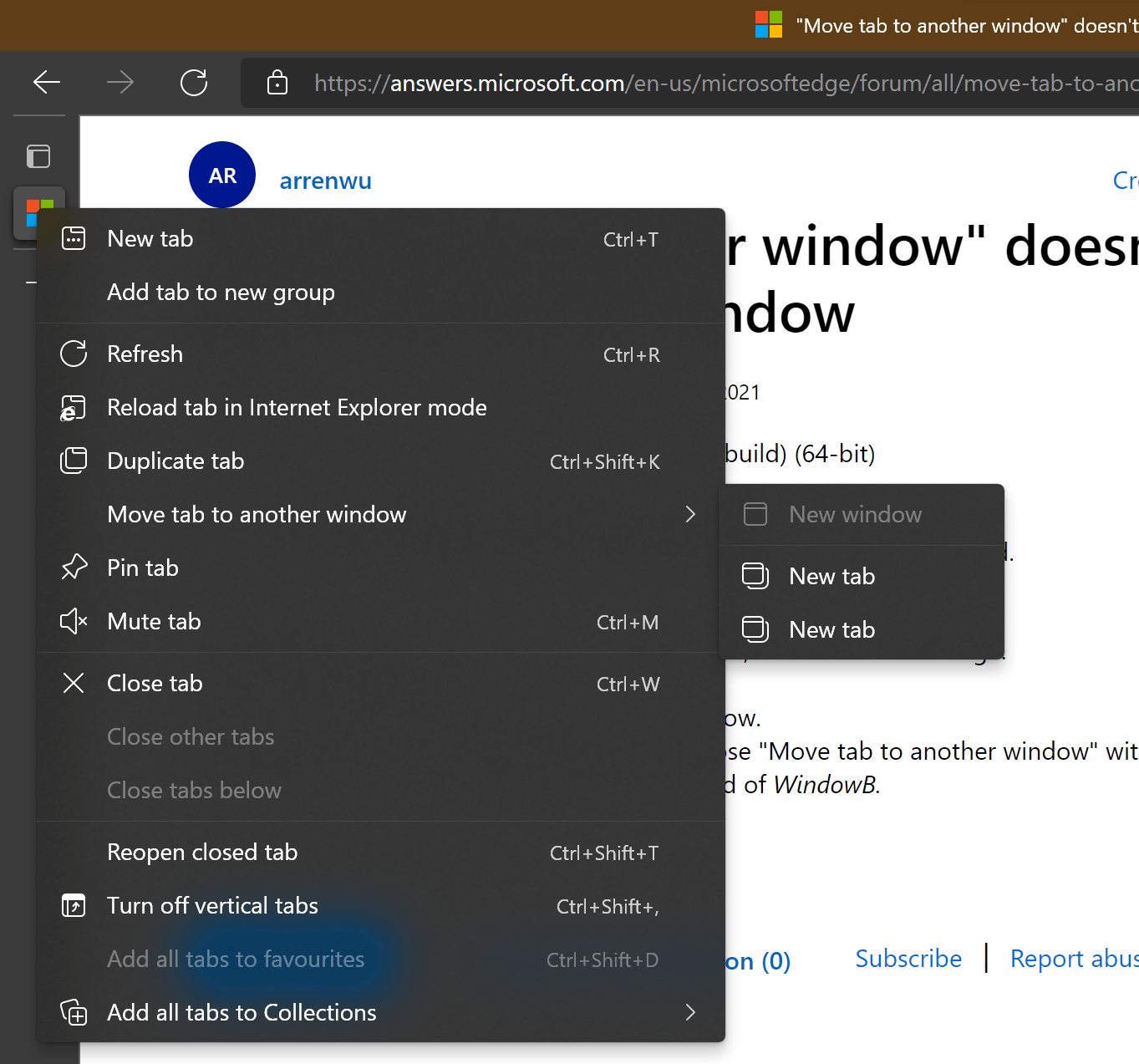 The function "Move tab to another window" doesn't work properly.