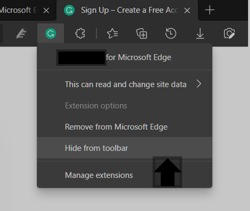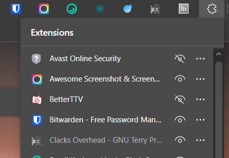 I just went to use Edge and the extension icon had appeared in my toolbar, I right clicked it and selected to hide it but then suddenly all my extension icons appeared on my toolbar taking up space. I now cannot hide any extensions that don't need any interaction from me (such as antivirus etc.) and they are talking up a lot of space.