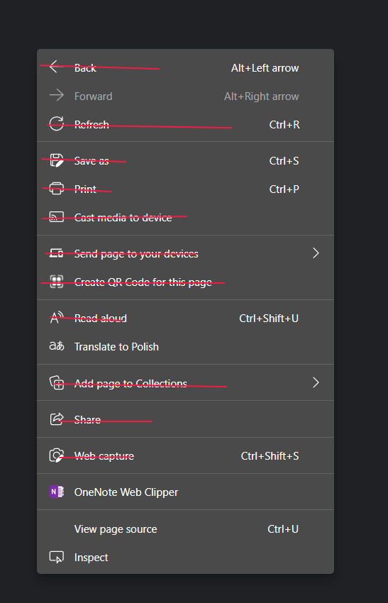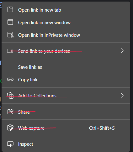 Based on my research, we don’t have the option to remove the Context Menu items on Microsoft Edge.