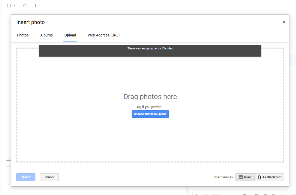 Accumulated cache and cookies can cause issues with Gmail. Clearing your browser's cache and cookies might resolve the upload error.