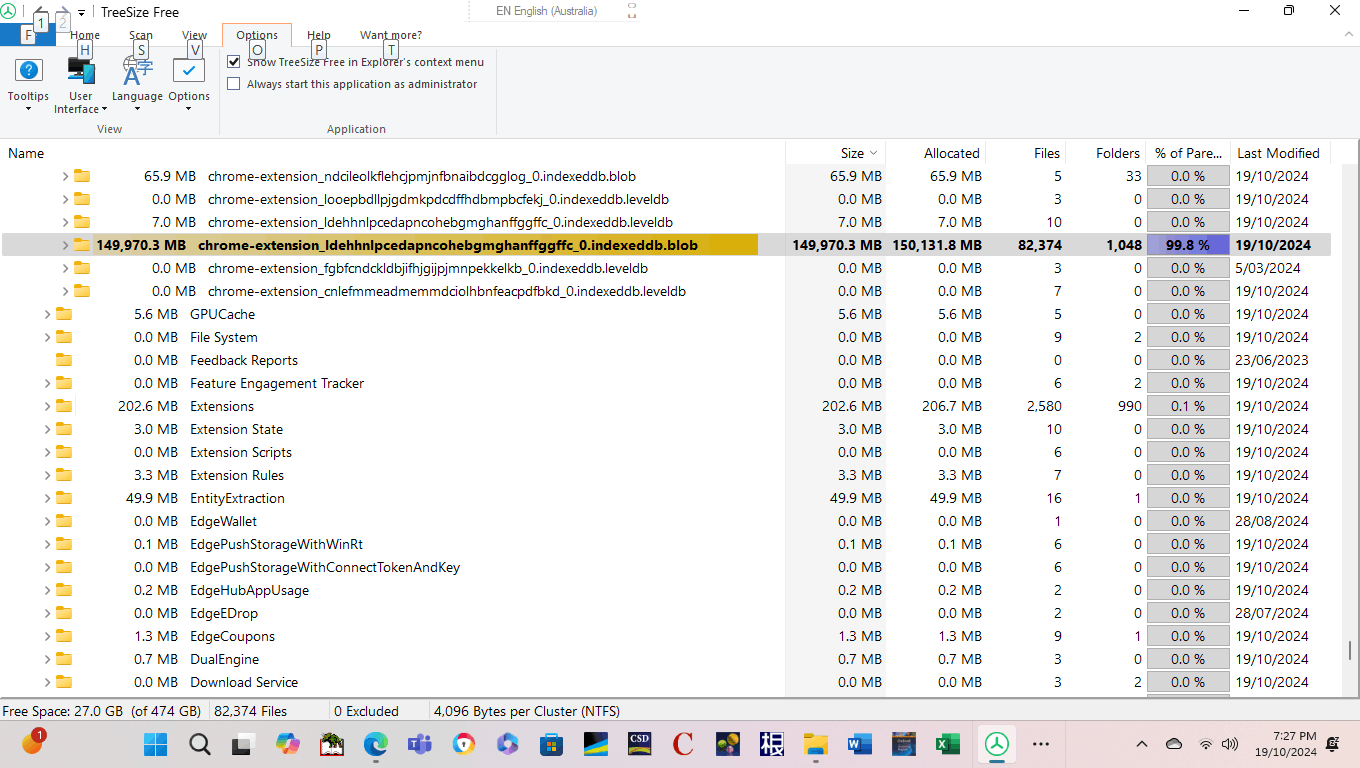 The subfolder named "extension_ldehhnlpcedapncohebgmghanffggffc_0.indexeddb.blob" under the directory "C:\Users....\AppData\Local\Microsoft\Edge\User Data\Default\IndexedDB" is around 149 gigabytes.