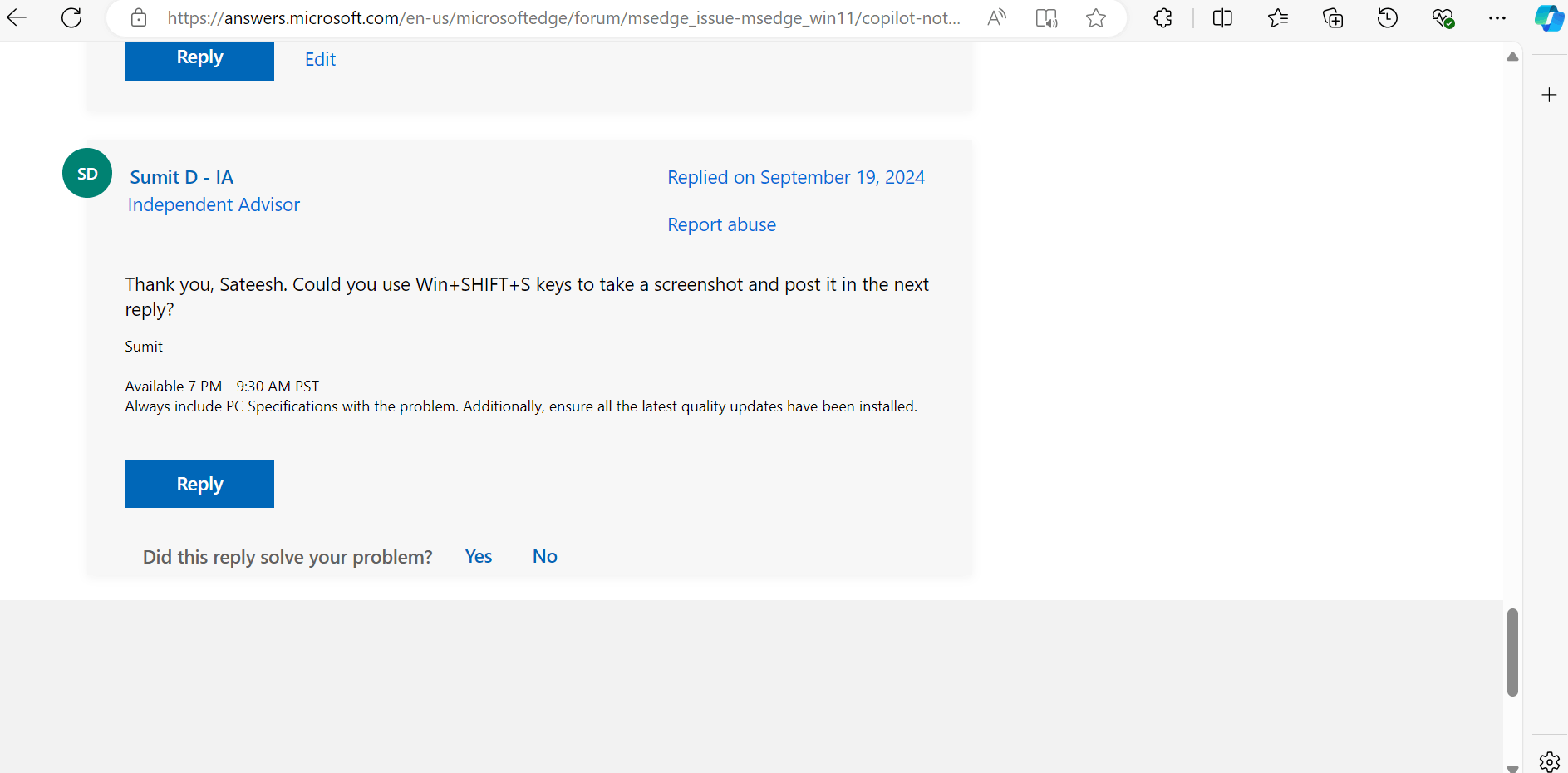 I am unable to using the copilot in edge browser and previously it should but now not able to.