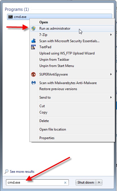 When the file is in the proper folder click the Start orb/button and open a Command Prompt window as Administrator like this:
