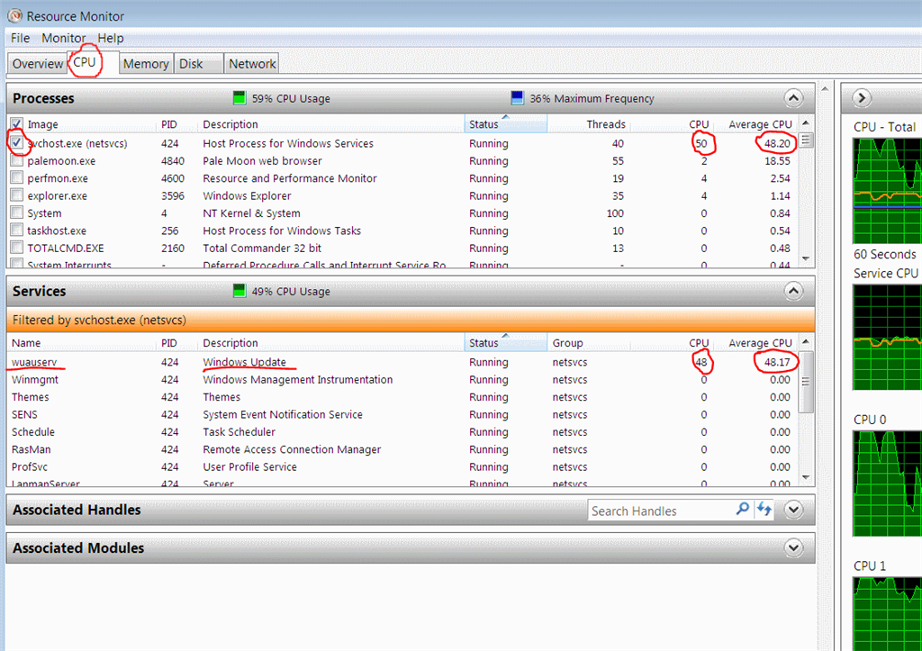 2015-11-19T15:25:55+00:00 Resource Monitor (resmon.exe) will show CPU usage of each SVCHOST-hosted service individually: