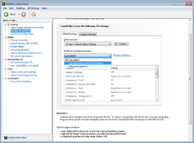 - Go to NVIDIA Control Panel and click on Manage 3D Settings > Preferred Graphics Processor. Check if the display card is set to use High-performance NVIDIA processor as your preferred graphics processor.