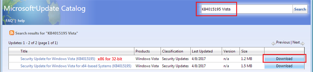 Note 1: Download 32-bit (x86) or 64-bit (x64) .msu installers from the Microsoft Update Catalog at the following links: