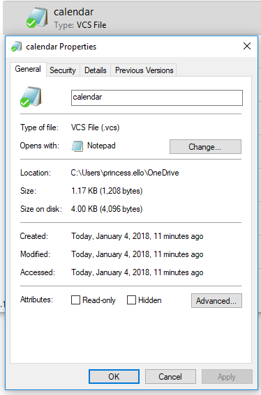 Lastly, if you change the .vcs file association to Notepad, the file description changes to VCS file instead of vCard file: