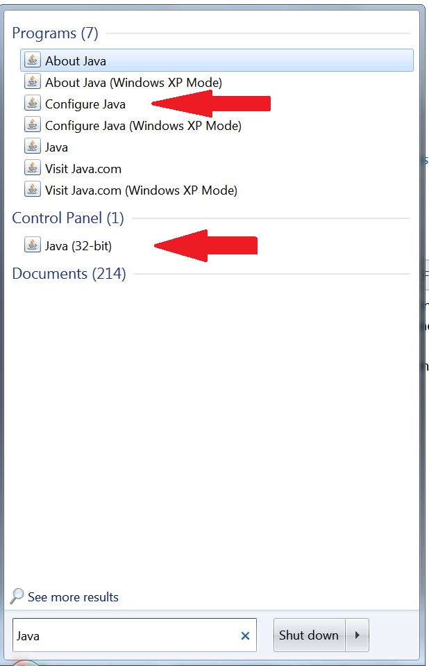 2. Assuming that Java is installed as confirmed in Step 1, click Start and type Java in the Search box. You should see something similar to the following. Either of the two entries marked with an arrow below will open the Java Control Panel.