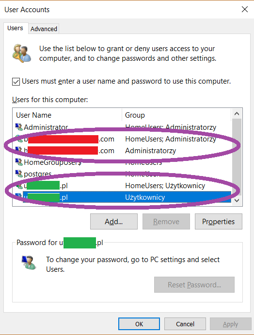 I have two admin accounts, (1) the new one I want to use b******************.com and (2) the built-in Administrator account I activated temporarily. The account I've been using for a long time (the one I want to change to a Standard User type) is u*********.pl