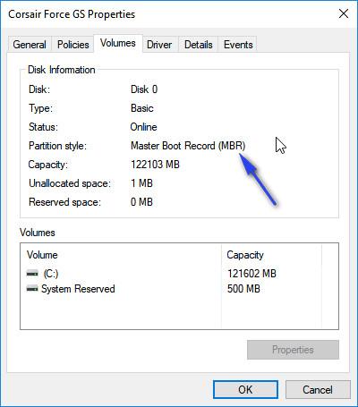 On the resulting dialog, click on the Volumes Tab, is that disc reported as MBR or GPT?