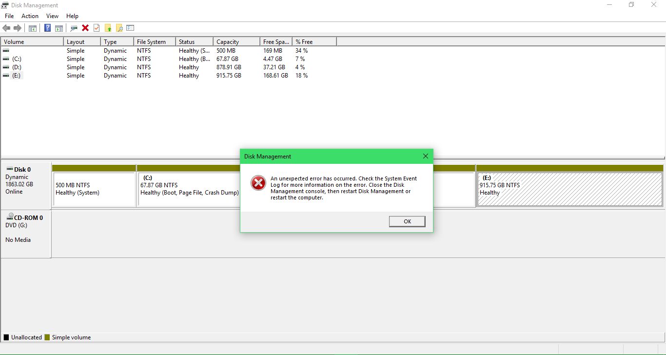 I tried to extend my system partition C by taking some free space from partition E and giving it to C partition so I decided to shrink 50GB from but when I tried to give that space to c partition and right click on c the extend volume was not available so I try using the 50 GB to make new partition and removing volume in hope the extend volume will be available but won't (notice when I made a new partition there was a message appeared saying something about dynamic partition or dynamic space, unfortunately, I didn't read it ) now when I tring to shrink some space form any partition there is a message saying " an unexpected error has occurred check the system event log for more information on the error . close the disk management console, then restart disk management or restart the computer "