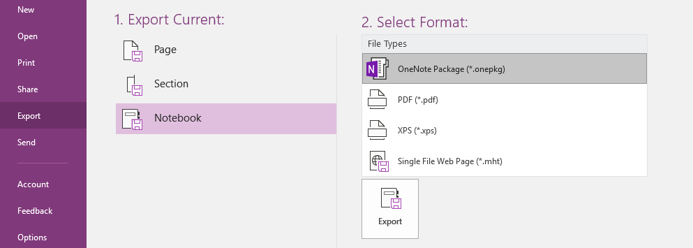 2.Click File > Export > Notebook > OneNote Package and Export this notebook.