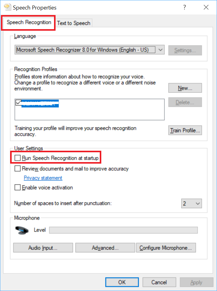Hello, to turn off speech recognition, go to the Windows search bar, then type in "speech", then choose Speech Recognition. Click on Advanced Options, then uncheck the "run speech recognition at startup" option. Restart the computer, and the speech recognition should no longer be there.