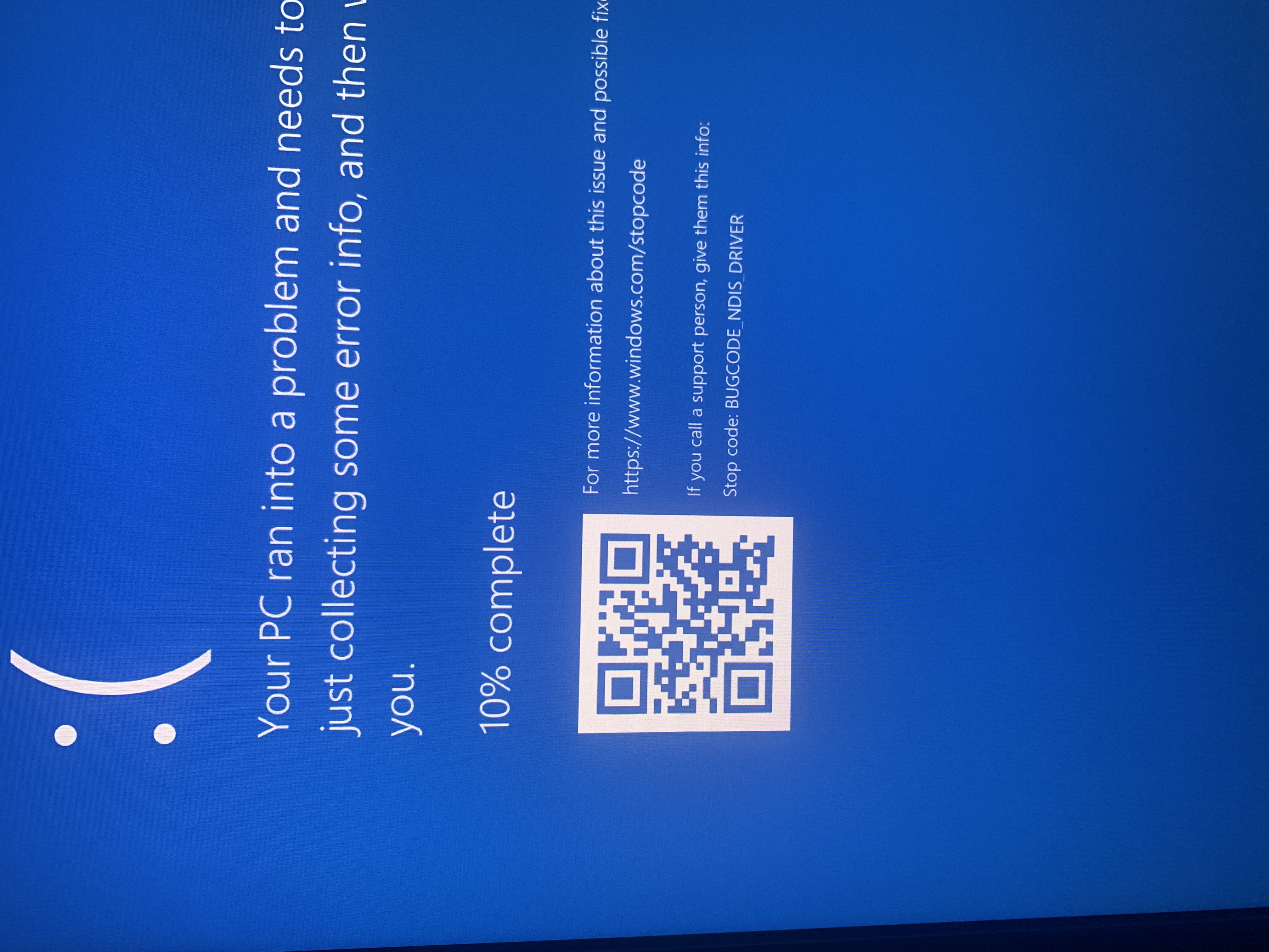 Upon trying to install using the Media Creation tool, once it installs, it will go through the entire install, restart and put me in an endless loop of restarting, first starting with a blue screen with the error code "BUGCODE NDIS DRIVER" with nothing else, and then a popup screen that says Your computer unexpectedly restarted and Windows cannot proceed with the install, your computer must be restarted.