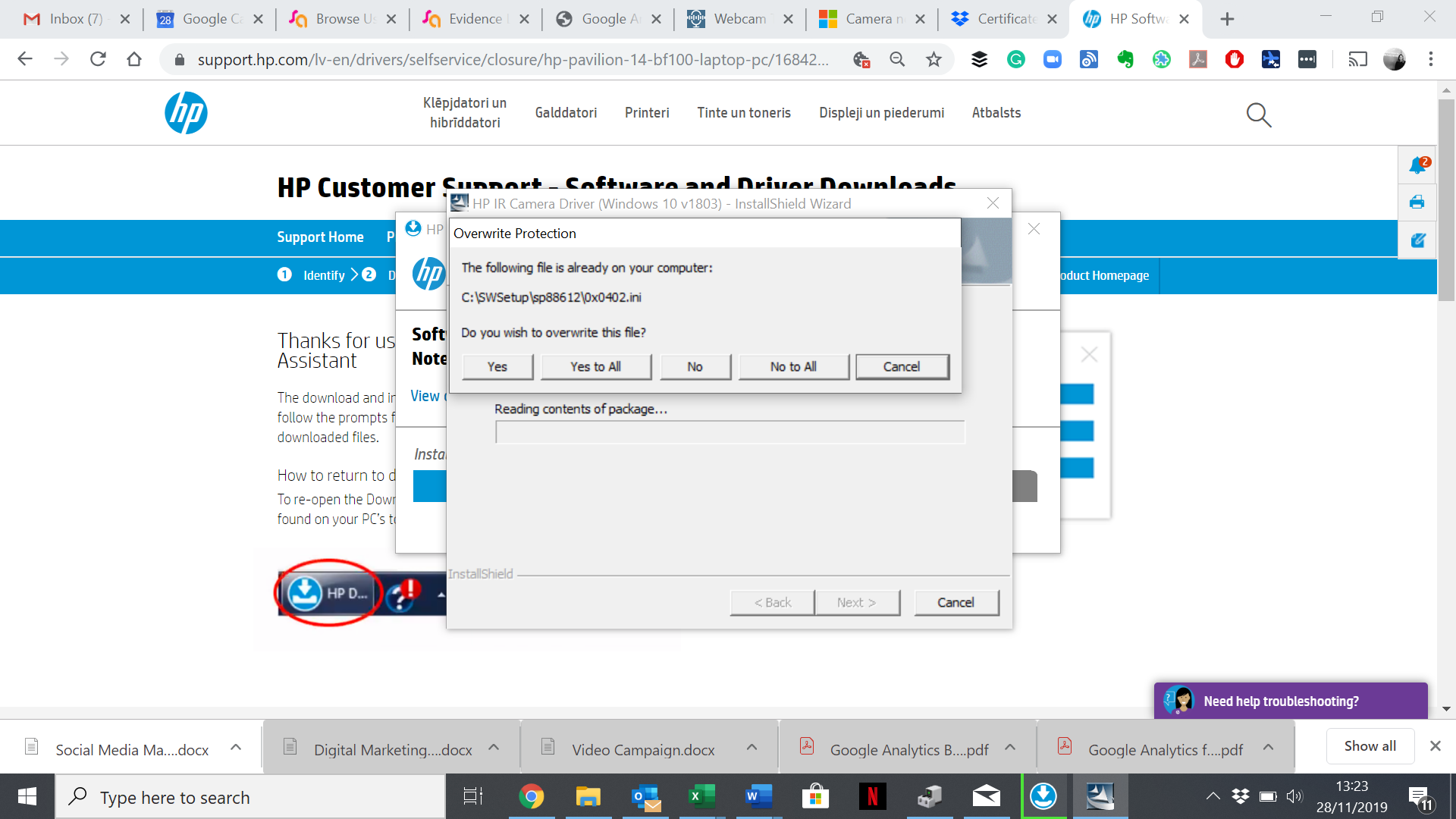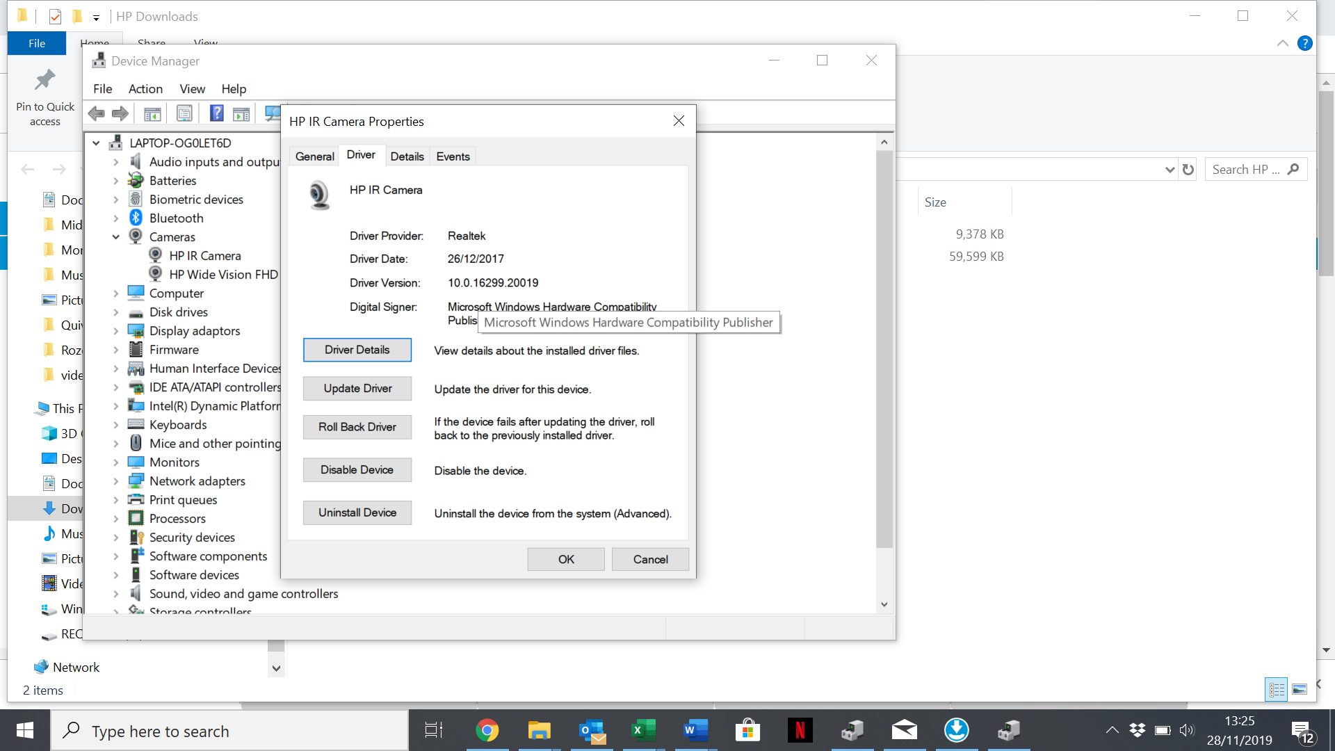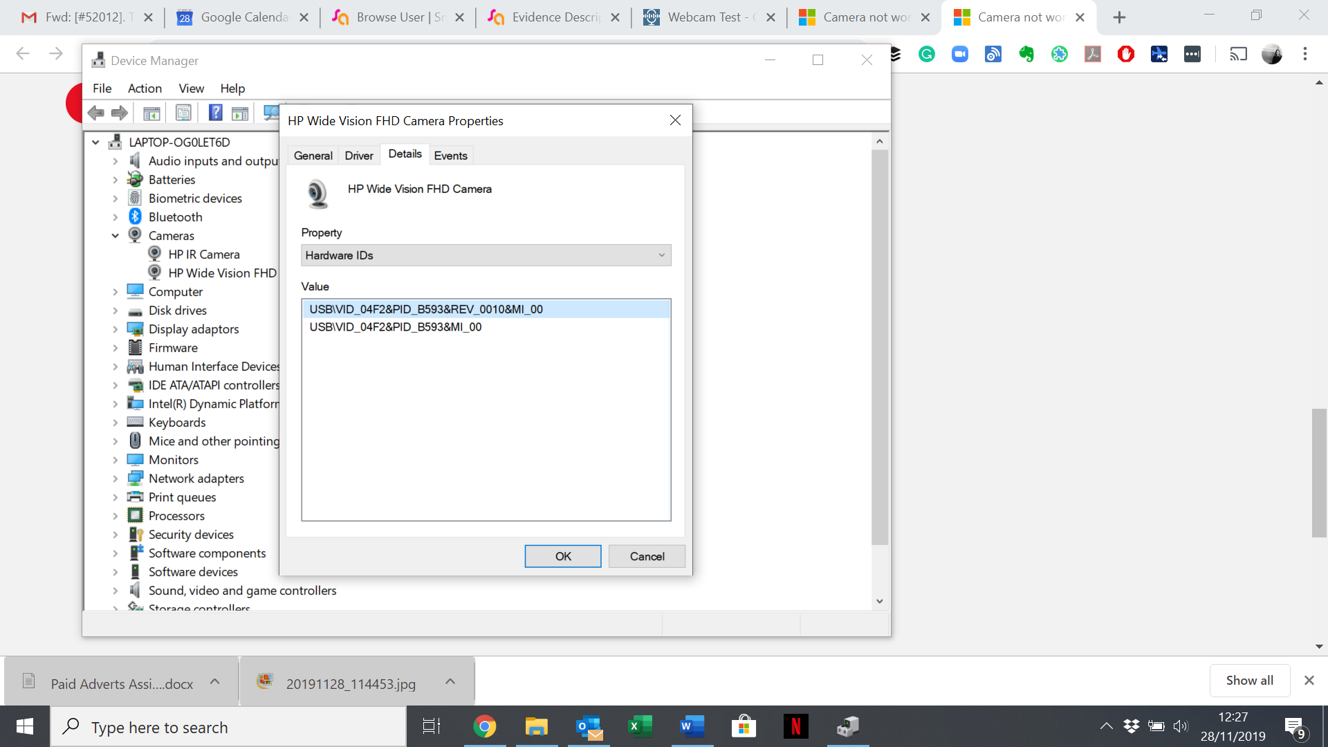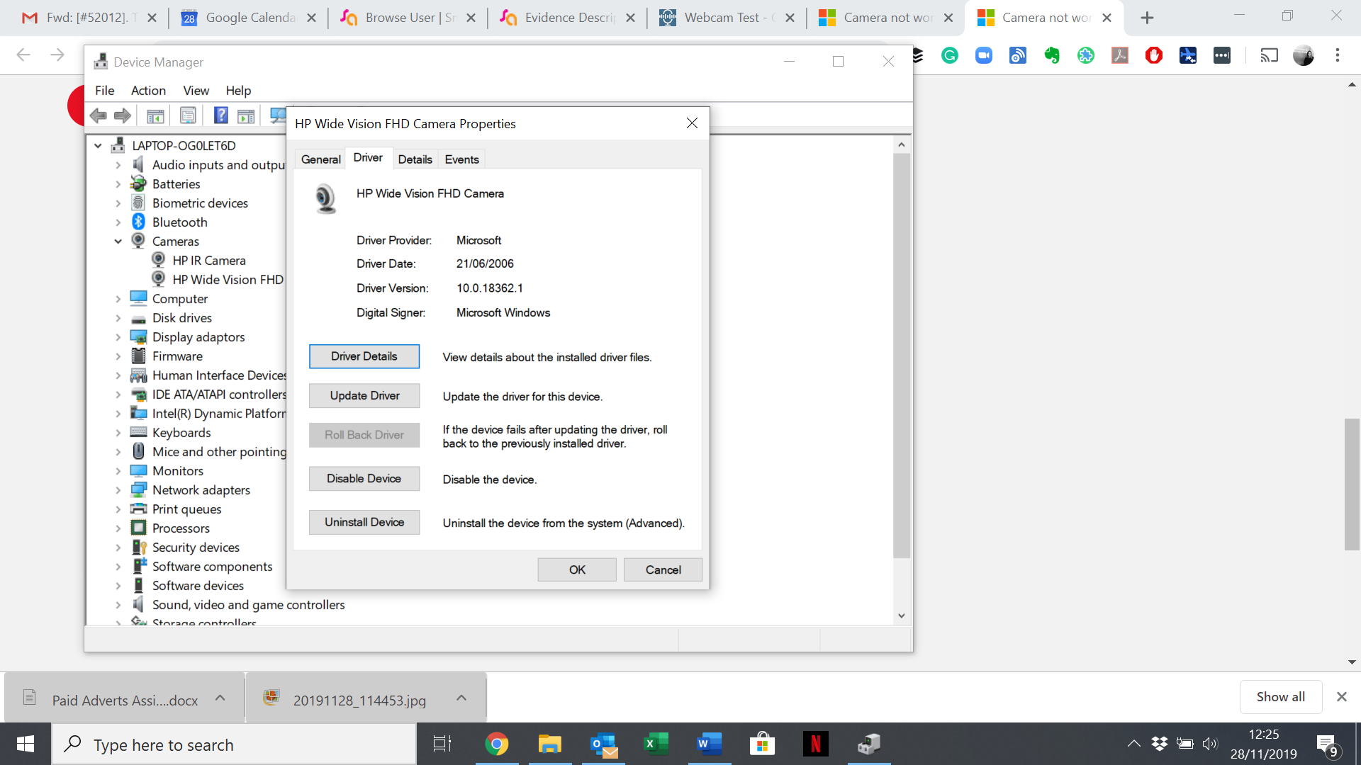 Can you please provide a screenshot to your Device manager with the camera tab is open under Drivers ? The laptop model number, and at best the Hardware ID well "click on the Camera in device manager, go to details. then choose hardware ID"